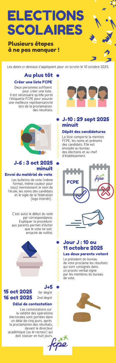- Notre infographie récapitulative du calendrier électoral à diffuser dans vos réseaux (electiondes parebtsd'eleves2025InfogFCPE2025.png) .